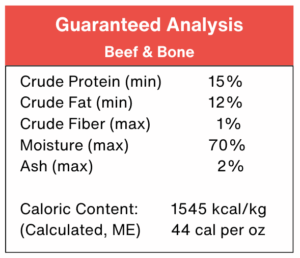 Raw Beef + Ground Bone Formula: 90% raw muscle beef, 10% ground beef bone